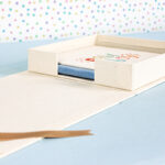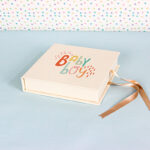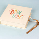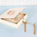 Caja con base de cartón forrada en lino y cierre de lazo de raso.