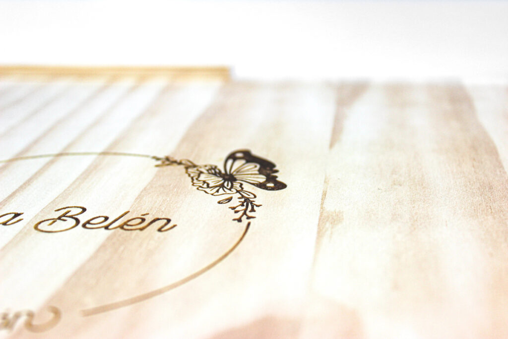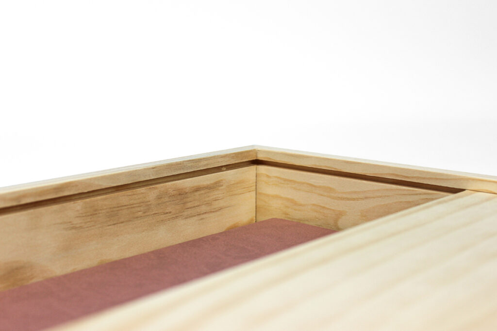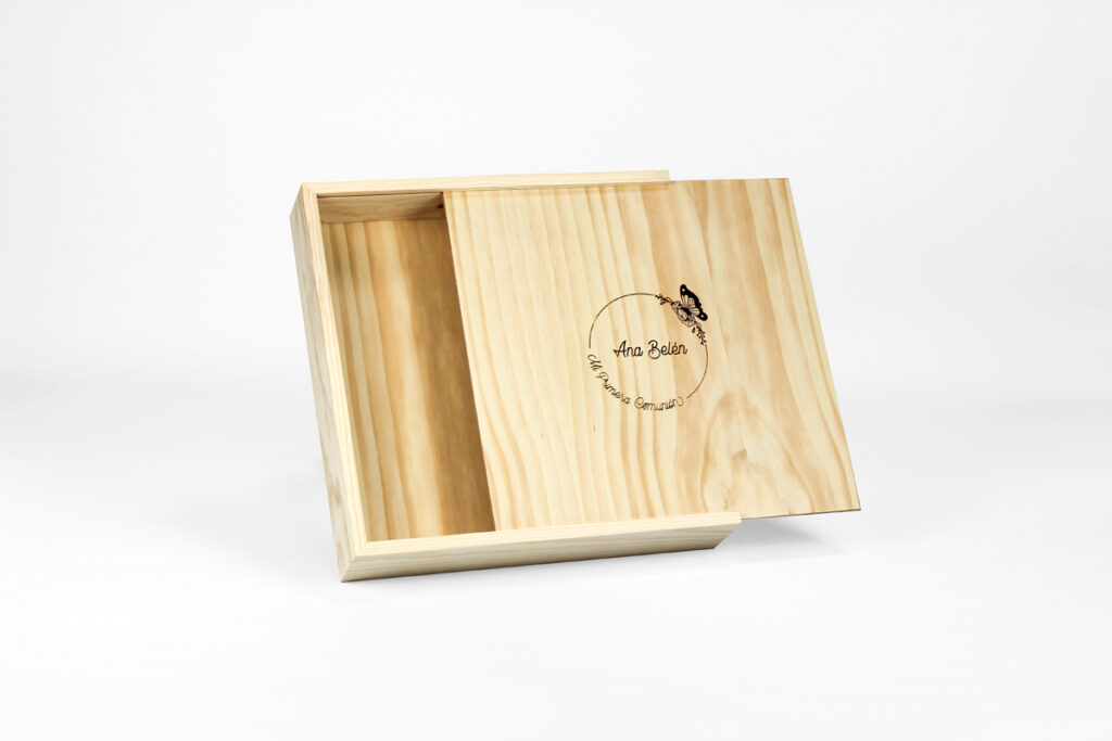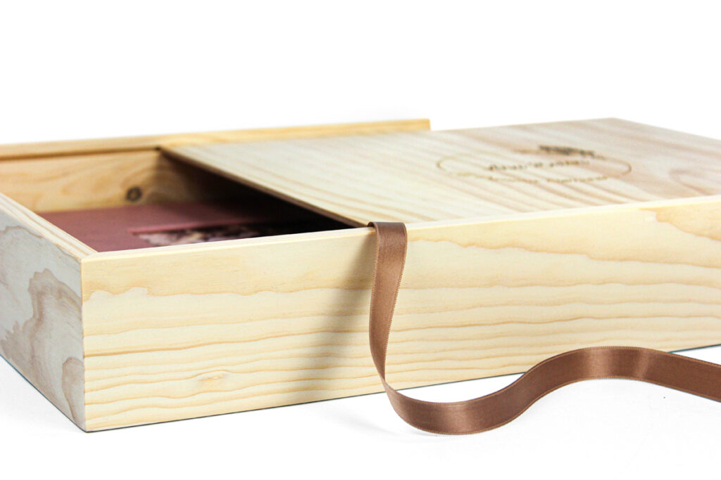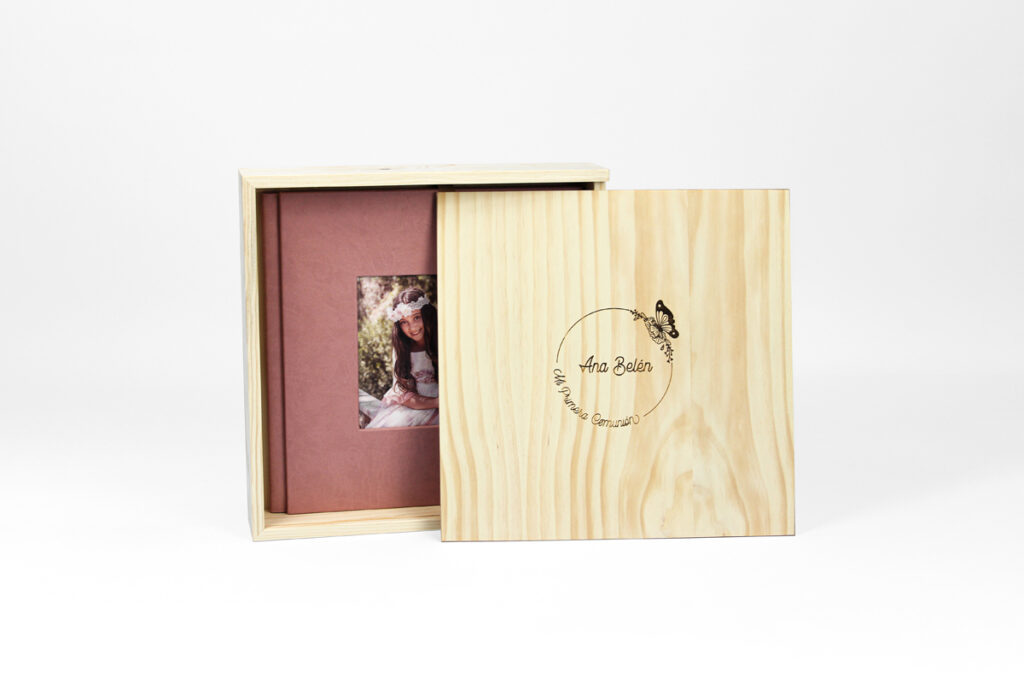 Álbum con portada personalizada o lisa en lino o polipiel. El álbum va acompañado de su caja de cartón blanca a medida.