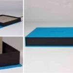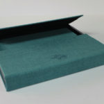 Caja con estructura de cartón forrado en lino y cubiertas y lomo en lino. Cierre de Imán.