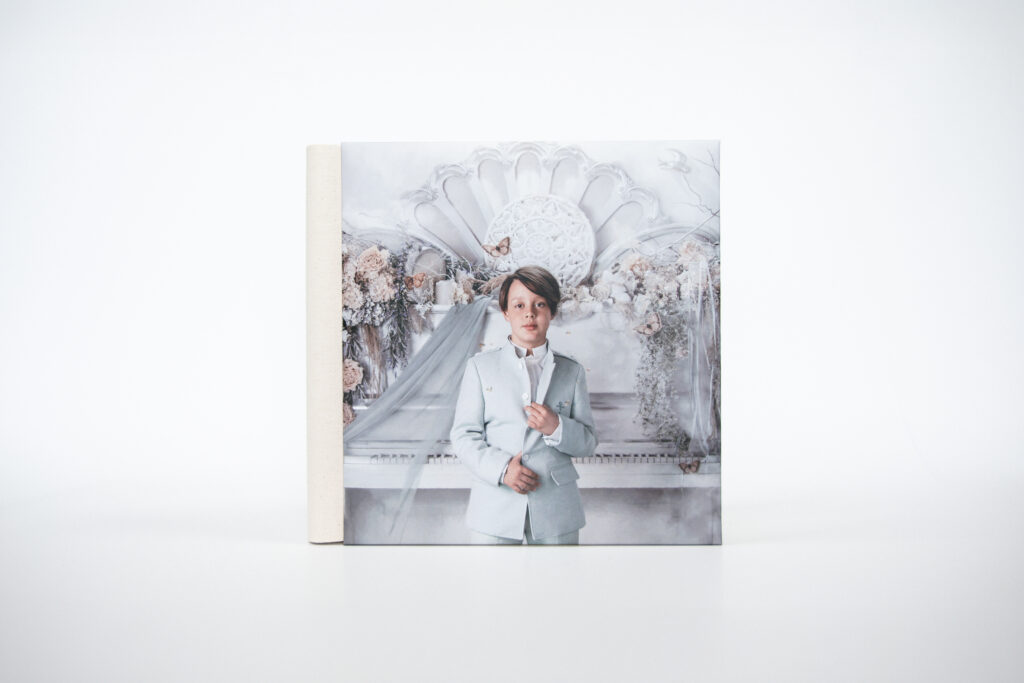 Su diseño limpio y atemporal permite que las imágenes respiren y se integren con equilibrio, creando un álbum que transmite calma, elegancia y coherencia visual desde el primer contacto. Cada pieza está concebida para perdurar en el tiempo y acompañar el recuerdo de la Comunión con discreción y sensibilidad.