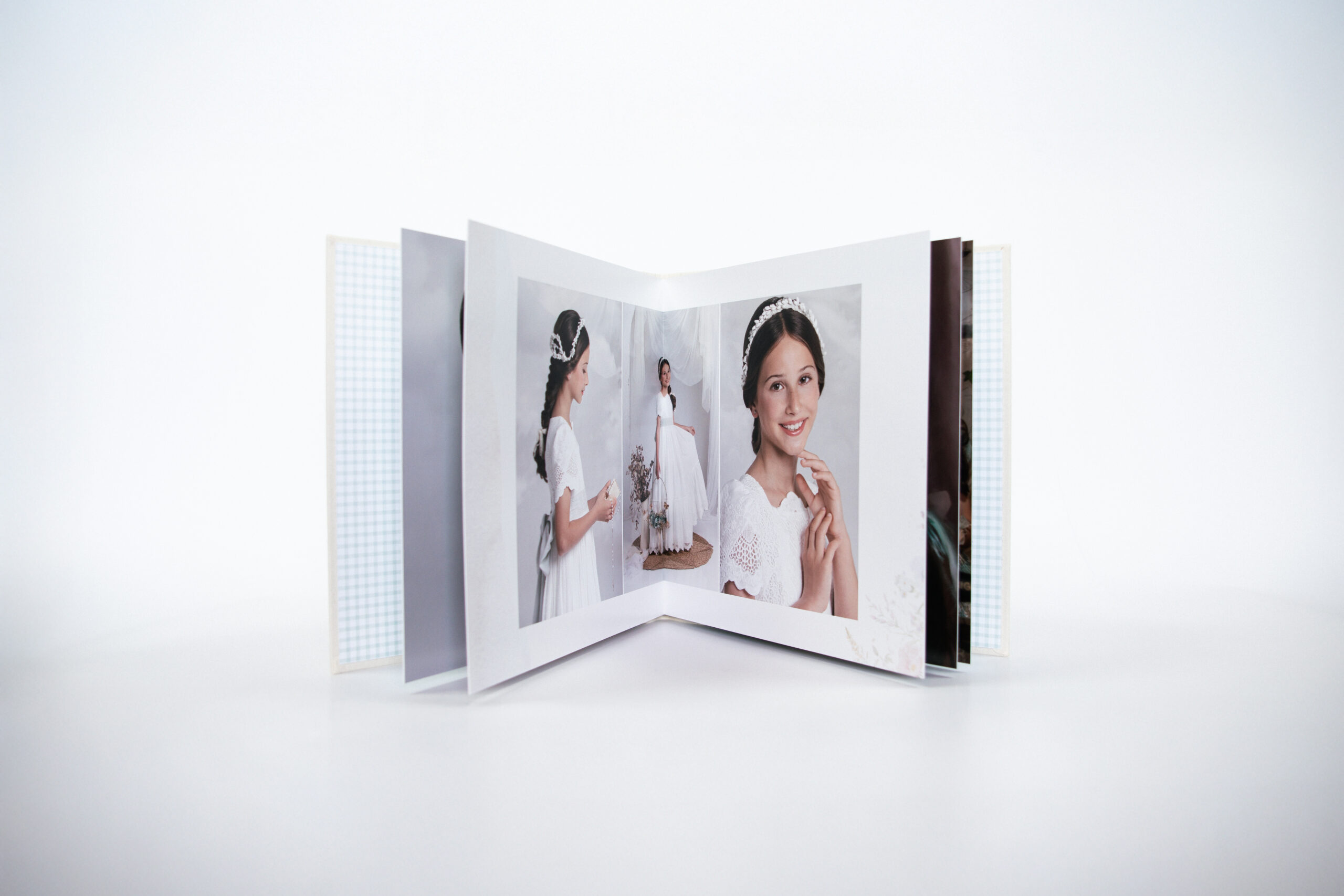 Su diseño limpio y atemporal permite que las imágenes respiren y se integren con equilibrio, creando un álbum que transmite calma, elegancia y coherencia visual desde el primer contacto. Cada pieza está concebida para perdurar en el tiempo y acompañar el recuerdo de la Comunión con discreción y sensibilidad.