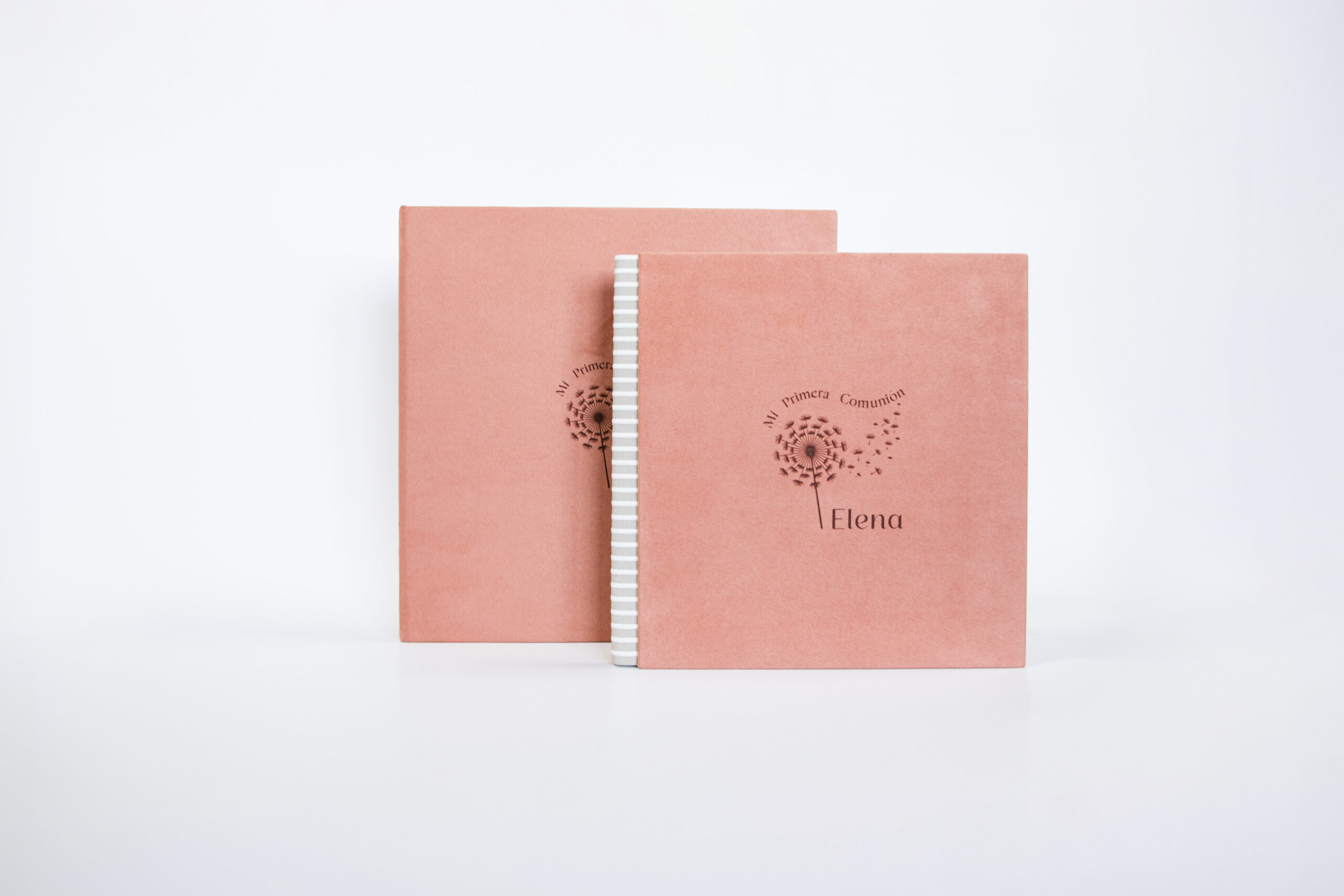 Álbum con portada personalizada o lisa en lino o polipiel. El álbum va acompañado de su caja de cartón blanca a medida.