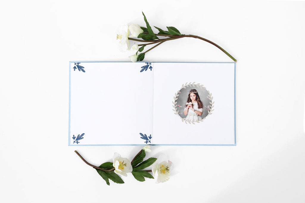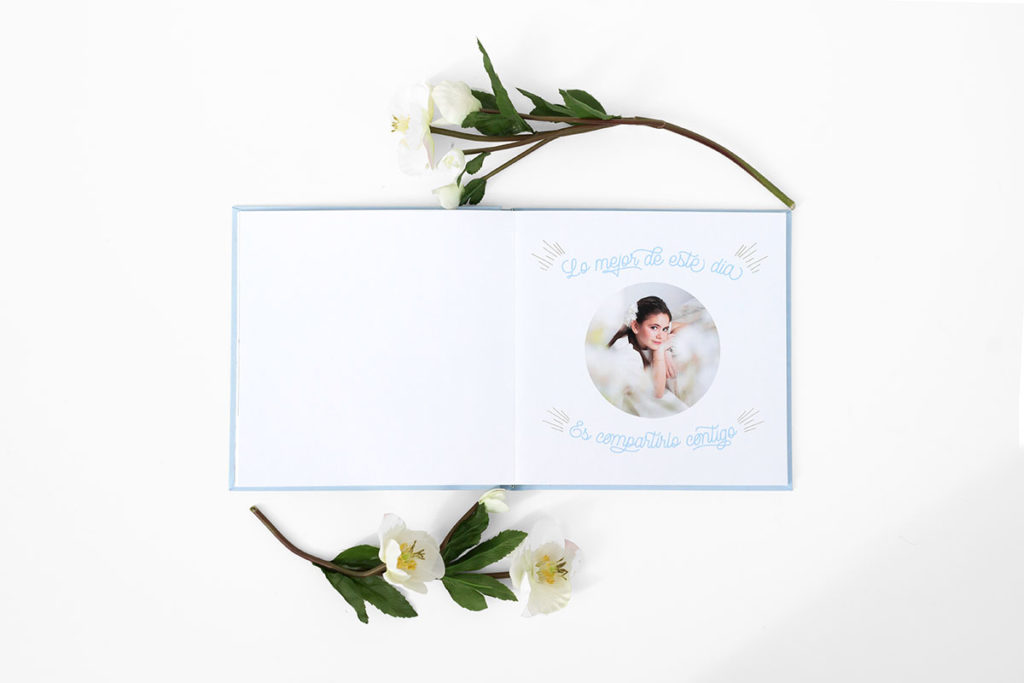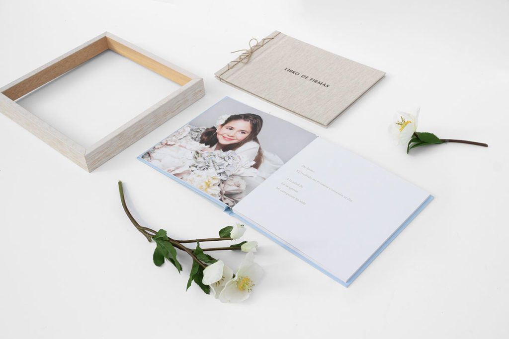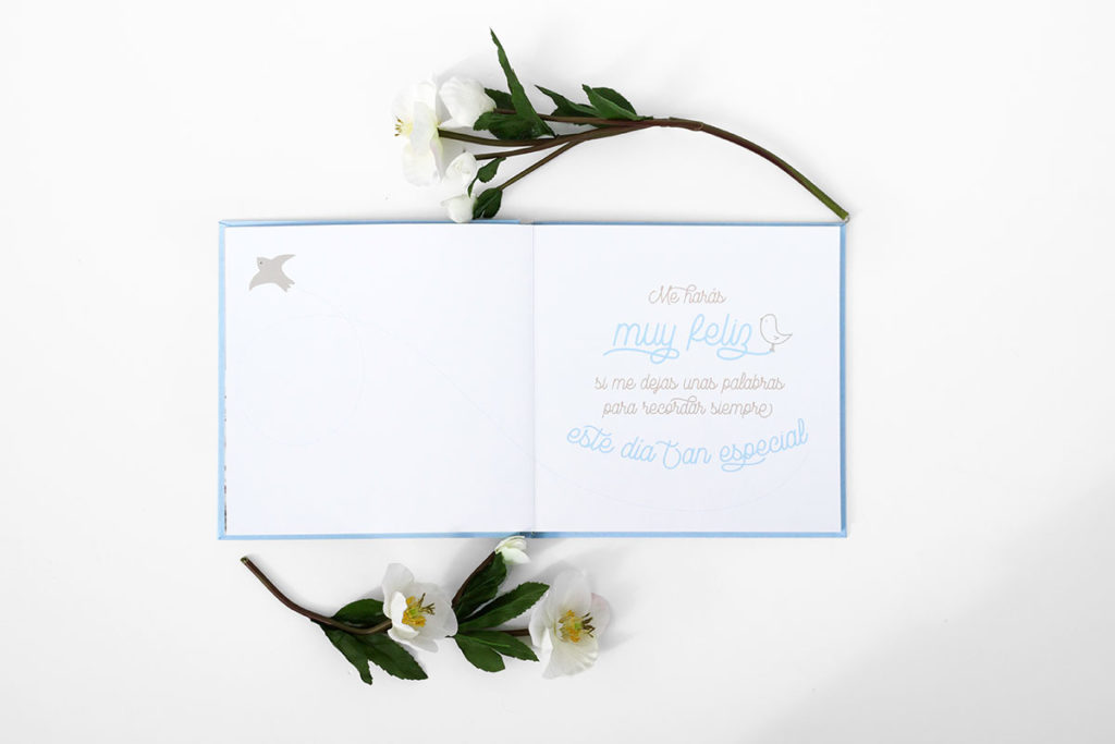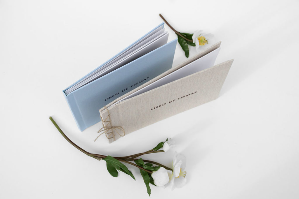 Libro de firmas con portada personalizada o lisa. En aquellos con portada lisa es posible realizar un golpe en seco con el nombre del niño o la niña. Existen dos modelos diferentes de libros de firmas.
