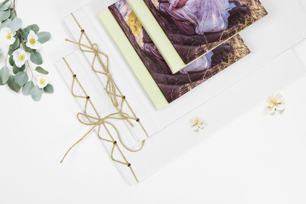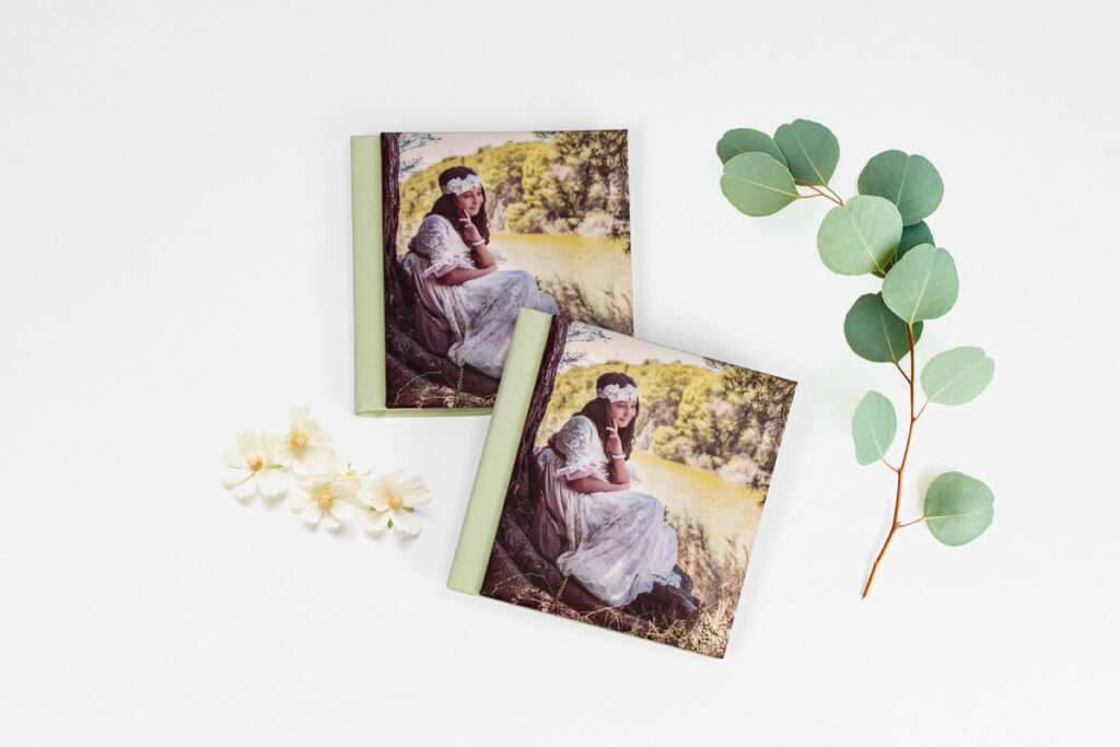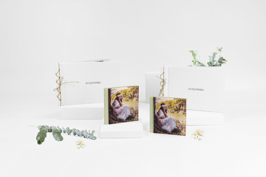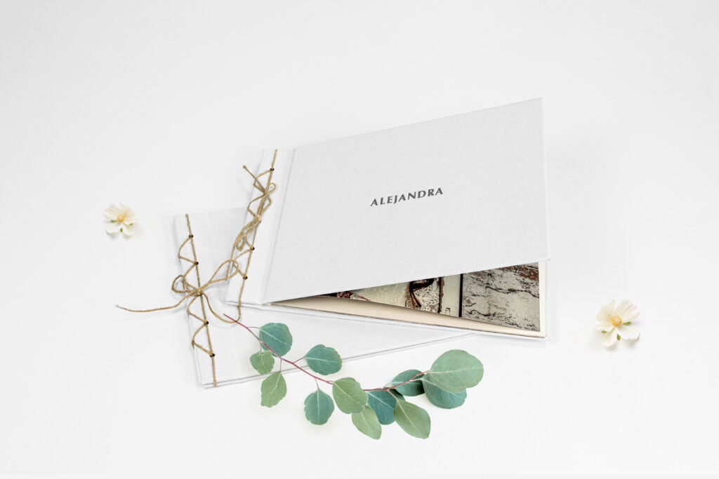 Lote de dos mini álbumes con portada personalizada o lisa en lino o polipiel. Cuatro tamaños diferentes. Siempre acompañados de su caja de cartón blanca.