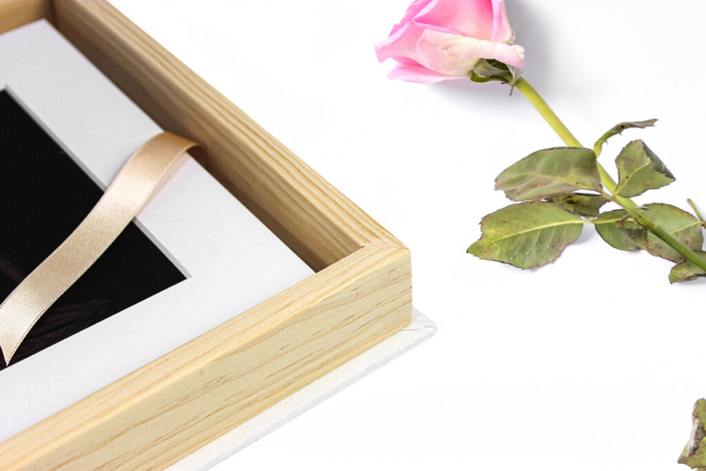 Caja con marco de madera natural de 25×20 cm con la posibilidad de impresión UVI, grabado láser o grabado seco (premium o normal)