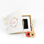Álbum con portada personalizada combinada con lino. Lleva una franja para grabar el nombre mediante golpe seco. Disponibles cuatro tamaños diferentes y tres colores distintos a elegir. Acompañado de su propia caja de madera blanca a juego con el álbum. Incluye la opción de personalizar el interior de la caja con una fotografía.