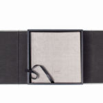 Álbum de material Touch, disponibles ocho colores distintos para elegir. Acompañado de su caja a juego con estructura de madera negra. Incluye grabado a láser en la caja y en la frontal del álbum.